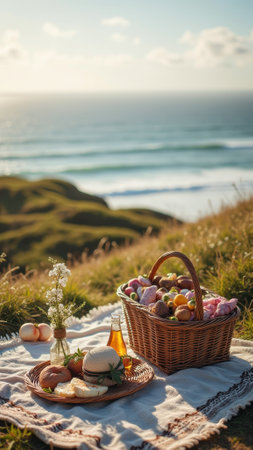 Serene coastal picnic with food basket on hillside overlooking ocean. That the image is generated using AI.