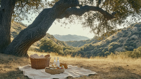 A serene picnic scene showcasing a soft blanket laid under a majestic tree, complete with a basket, food, and a floral arrangement, inviting relaxation in nature.