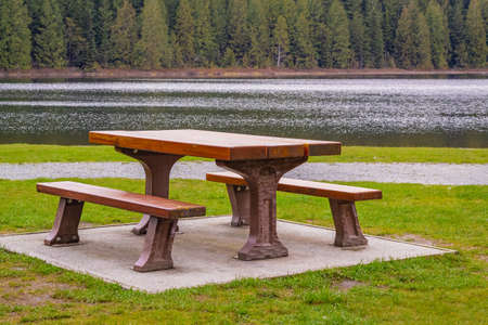 A rustic picnic table adorned with a red checkered cloth sits peacefully by a tranquil lake, surrounded by lush evergreen trees at sunset.