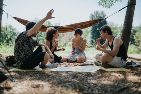 Friends share a relaxed picnic in the park under a hammock and sunny trees