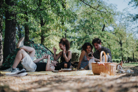 Friends enjoy a sunny park picnic with tent and blanket, sharing laughter and conversation outdoors