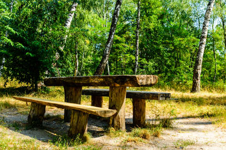 wooden seat in a park. Picnic in the park. Rest in the open area. Wooden picnic table and seats. Street view, travel photo, nobody, selective focus