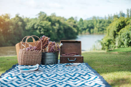 picnic set in the park near river, dried flowers, baskets wine bottle, book and retro gramophone vinyl record. Summer, spring and vacation concept