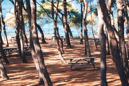 a picnic spot on the Prince Islands. camping area in Istanbul. wooden table in the park