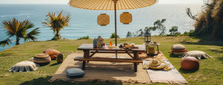 a boho picnic setup on lush grass near the ocean, featuring a cozy table set for two and a charming umbrella casting shade overhead, evoking a tranquil atmosphere ideal for seaside relaxation