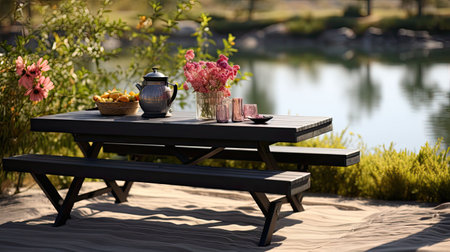 A picnic table with benches arranged on the shore of a river, providing a spot for outdoor dining and relaxation, A delightful picnic spread next to a serene fishing spot in the forest, AI Generated