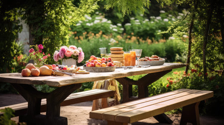 A beautifully arranged outdoor table featuring an array of delicious food and refreshing drinks, all set in a vibrant natural environment. Perfect for summer gatherings.