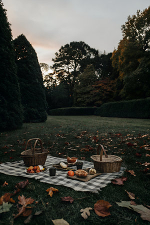 A cozy autumn picnic spread on a checkered blanket in a park, with fallen leaves scattered on the grass and trees in the background