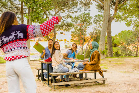 Group of friends having a picnic in a park on a sunny day