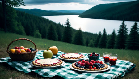 A picturesque picnic setup with freshly baked pies and fruits on a checkered blanket, overlooking a calm mountain lake.. AI Generation
