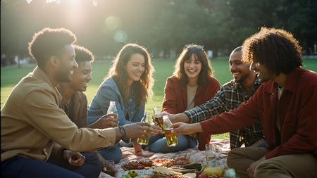 A group of five friends, diverse in ethnicity and age, sit on a blanket in a park, enjoying a picnic with food, drinks, and laughter on a sunny day.