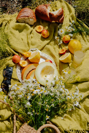 Bright fruits and baked bread are arranged beautifully on a yellow blanket. Lemonade sits nearby, accompanied by wildflowers, creating a cheerful summer picnic atmosphere outdoors.