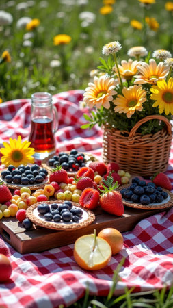 Summer picnic spread with fresh berries, strawberries, and flowers in a sunny outdoor setting. That the image is generated using AI.