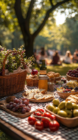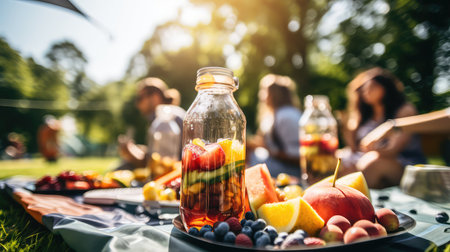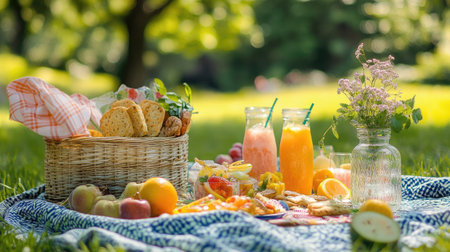 A cheerful picnic spread featuring organic snacks, fruits, and drinks, set against a sunny park backdrop