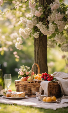 A romantic spring picnic setup in a blooming garden under a flowering tree. A wicker basket filled with fresh fruit, a bottle of sparkling drink, elegant glassware, and pastries arranged on a soft blanket. Surrounded by lush greenery and delicate blossoms, creating a peaceful and dreamy atmosphere. No people, just natural beauty and cozy details. Perfect for themes of romance, springtime, relaxation, or outdoor lifestyle.