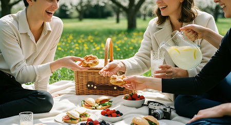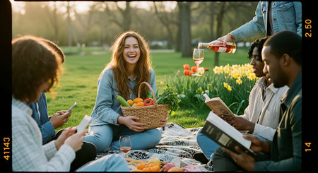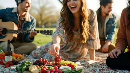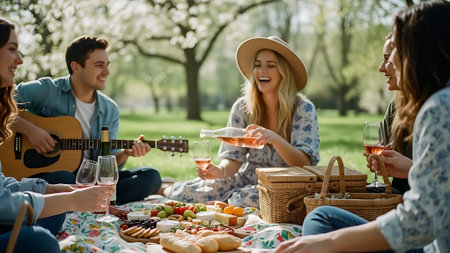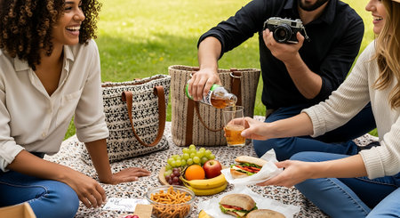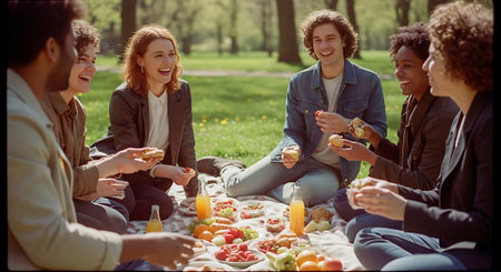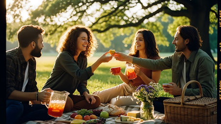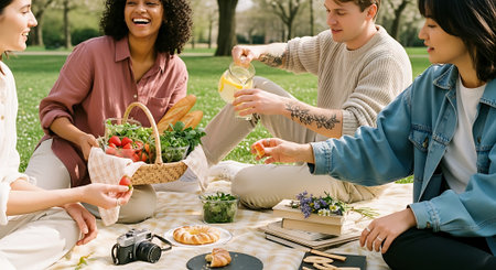 A group of friends enjoying a picnic in a park, sharing food and drinks, laughing and having a good time