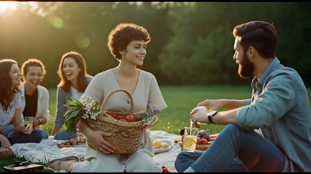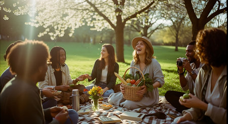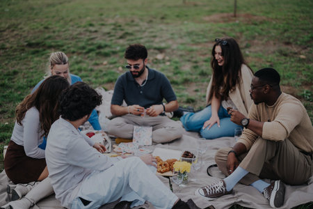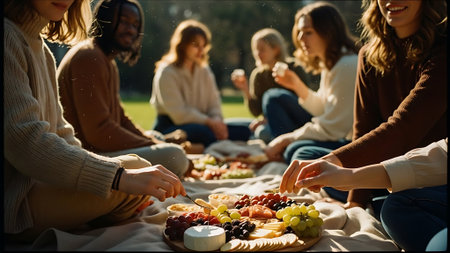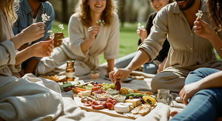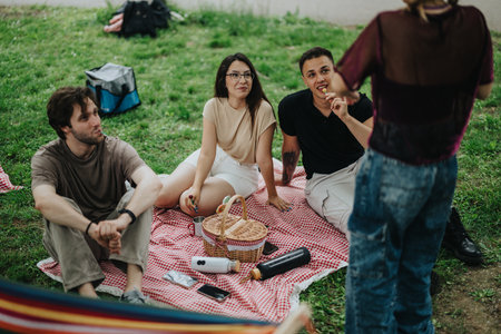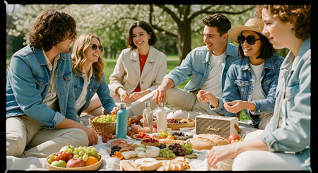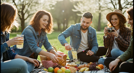 Group of friends having a picnic in a park on a sunny day