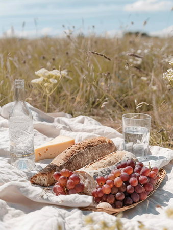 This image portrays a simple yet idyllic seaside picnic with a clear blue sky overhead. A bottle of sparkling water, fresh bread, cheese, and grapes are carefully placed on a wooden board, adding a touch of rustic charm. The calming presence of the sea and the gentle breeze make for a tranquil lunch setting.
