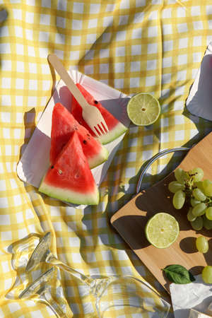 Summer picnic with watermelon, strawberries and blueberries on a checkered tablecloth