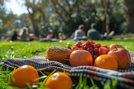 A delightful outdoor picnic scene with fresh fruits and a sandwich on a blanket, set in a sunlit park with people relaxing in the background.