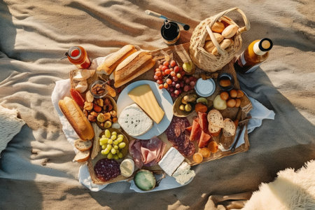 top view of picnic blanket with wine, snacks and bread on sand