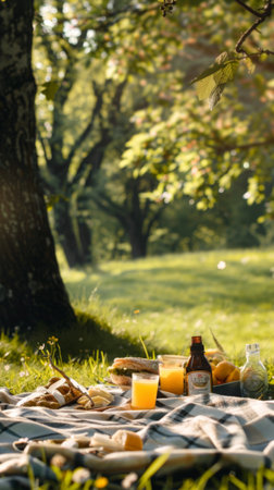 Gathered on a cozy blanket amid lush greenery, friends enjoy a delightful picnic filled with delicious food and drinks. The warm sunlight filters through the trees, creating a serene atmosphere.