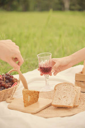 picnic concept someone handing a glass of grapes juice to another who tries to pick up a crispy bread while being on a picnic.