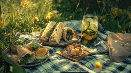 Enjoy a peaceful picnic in a lush green setting filled with nature's beauty. Healthy wraps and refreshing fruit await on a cozy blanket, inviting relaxation and connection.