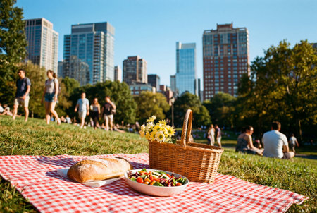 Picnic scene in a city park with a red and white checked blanket, fresh food, and a wicker basket, surrounded by people enjoying the outdoors and city skyline