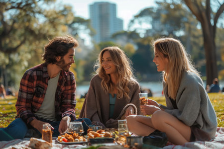 Friends enjoying picnic in sunny park.