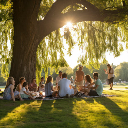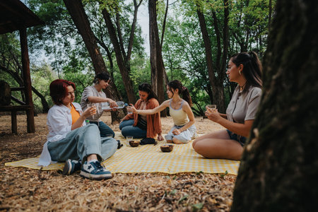Group of friends having a picnic under the shade of trees on a sunny day. Enjoying food, drinks, and good company in a natural setting.