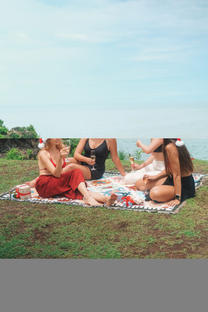 Young women friends have a Christmas picnic, they are sitting on a cliff with the ocean in the background, holding glasses of champagne. They are wearing Santa hats and bikinis. Tropical New Year.