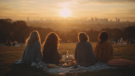 Four friends sit on ground facing away watching beautiful sunset view of city skyline, feeling peace and relaxation together outdoors on hill