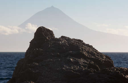 Azores volcanic rock with Pico mountain and atlantic ocean. Portugal. Horizontal