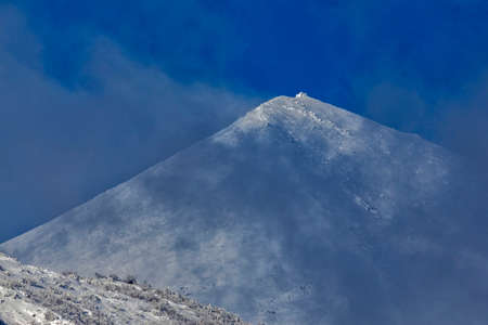 Minimal mountain landscape with black peaked top with white snow under blue sky. Snow-covered pointy peak in sunlight. Atmospheric mountain scenery with peaked top in sunshine. Awesome mountain top.