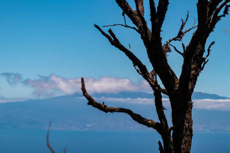 Barren tree branch with scenic view on the cloud covered volcano mountain peak Pico del Teide on Tenerife seen from laurel forest near Roque de Agando on La Gomera, Canary Islands, Spain, Europe. Hike