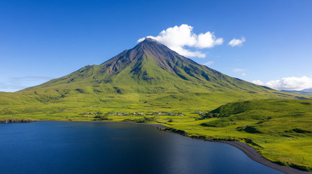 Aerial view of Pico Mountain in the Azores, Portugal. Green slopes meet a dark lake under a blue sky with a single cloud. A small village nestles at the mountain's base.