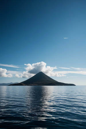 Lonely mountain at sea and blue sky and white clouds landscape