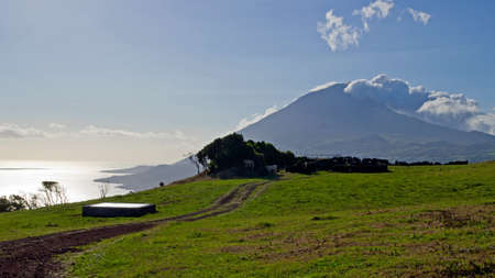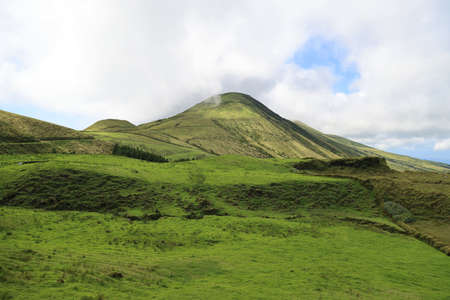 Lanscape near EN3 longitudinal road northeast of Mount Pico and the silhouette of the Mount Pico along , Pico island, Azores, Portugal. Photo taken in Azores, Portugal.