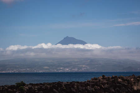 Mount Pico volcano western slope viewed from ocean with summit in clouds, seen from Faial Island in Azores, Portugal.