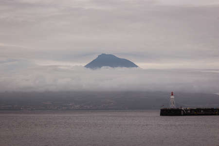 Pico volcano covered with clouds view from the ferry Pico island Azores Portugal