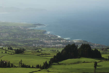 Sunset over the South Coast of Sao Miguel island in the Azores. Golden hour landscape of Sao Miguel island, Azores, Portugal