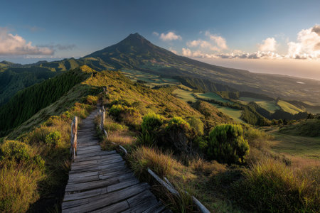 Stunning sunrise panorama of sete, camesa trail, and volcano in the azores, portugal