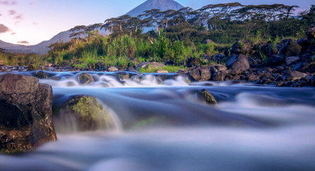 Slamet mountains silhouettes sunset panorama and river reflection