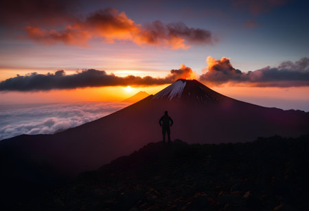 A person standing at the peak of a volcano, silhouetted against a stunning sunset.