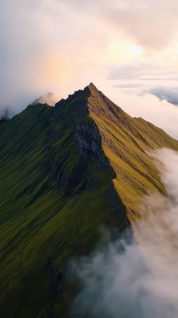 A stunning view of a solitary mountain peak enveloped in mist and fog. The serene landscape embodies tranquility, making it perfect for nature enthusiasts and wanderers.