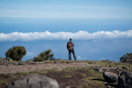 Island of Madeira, Portugal. High mountains pico ariero pico ruivo hiking trail. Beautiful peaks with a sea of clouds over the ocean around the island. Blue sky perfect sunny day.