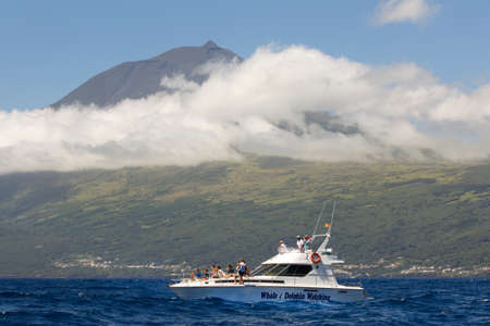 Azores coastline landscape in Pico island with whale watching boat. Horizontal