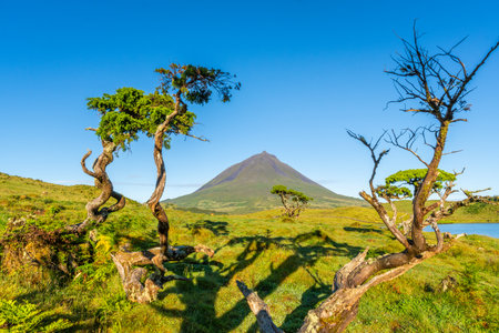Mount Pico and Azores Juniper Trees in Sunny Morning. Pico Island, Azores. Portugal