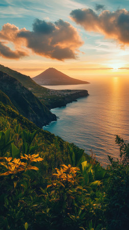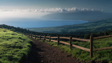 A photograph of a path leading to the top with wooden railings overlooking green hills and a valley. The sky is blue with some clouds, and the sun sets behind it. In front, you can see an ocean surrounded by mountains, Azores, Portugal, in a panoramic view. --chaos 30 --ar 16:9 --v 6.1 Job ID: c82a439a-e8ab-4180-80a3-bb59917eaa35